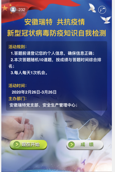 為教育和引導員工掌握必要必備的防疫知識,自覺做好個人防護,安徽瑞特黨支部深入貫徹落實上級黨委疫情防控和復工復產工作部署,迅速采取行動,利用微信工作群這一載體,聯合安全生產管理中心積極開展微信在線有獎競答活動,齊心協力打好疫情防控阻擊戰,確保疫情防控、安全生產兩不誤。