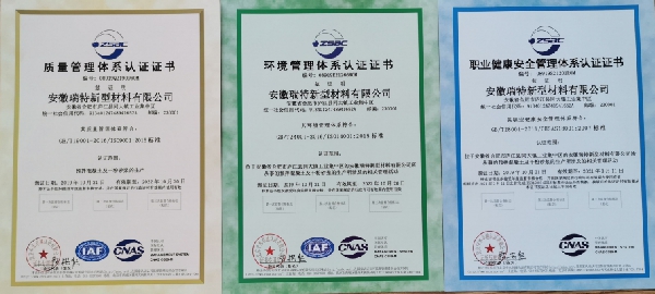 安徽瑞特在追求產品質量,確保環境衛生、職業健康安全的路上不曾懈怠,公司牢固樹立“三體系”標準化管理理念并將此理念貫穿生產、經營和服務的全過程。公司自今年9月開始就著手準備取證所需相關資料,經過各部門近兩個月不懈努力,順利通過質量管理、環境管理、職業健康安全管理三體系認證審核,并于近日取得“三體系”中英文版認證證書,使公司質量、環境、安全管理邁上一個新的臺階。