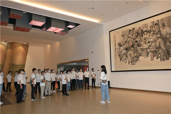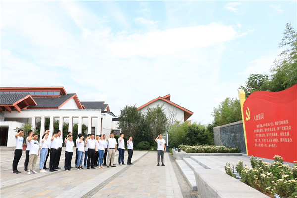 參觀結束后,全體黨員來到陳列館門前,在鮮紅的黨旗下,再一次舉起右拳,重溫入黨誓詞,作出莊嚴宣誓。