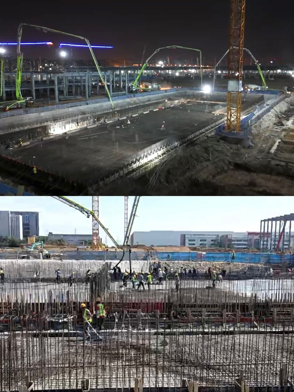 此次大體積筏板澆筑時間緊、任務(wù)重,難度大,澆筑期間最高溫度達38℃,持續(xù)高溫更是為澆筑任務(wù)帶來極大挑戰(zhàn)。為確保倉面順利澆筑,公司領(lǐng)導(dǎo)班子帶隊進行現(xiàn)場踏勘,并結(jié)合現(xiàn)場實際組織制定專項澆筑方案以及應(yīng)急預(yù)案。澆筑期間,各站點協(xié)同合作,各部門全程跟蹤服務(wù),做好材料保供、現(xiàn)場信息反饋、生產(chǎn)運輸、車輛統(tǒng)籌調(diào)度等工作,在全體人員的共同努力下,僅20小時完成澆筑,較原計劃提前10小時完成,高效率保障服務(wù)得到施工方高度認可。