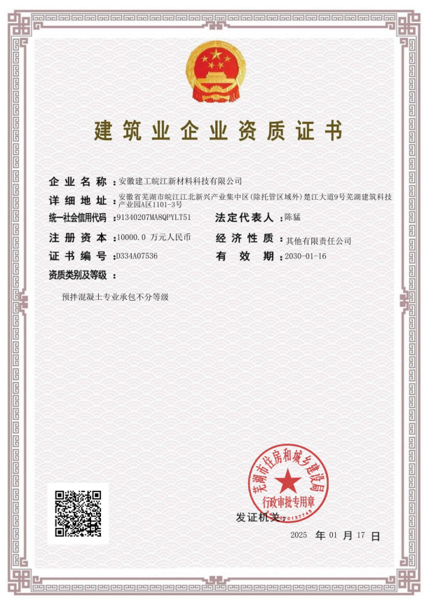 喜報!安徽建工皖江新材料科技有限公司取得預拌混凝土專業(yè)承包資質