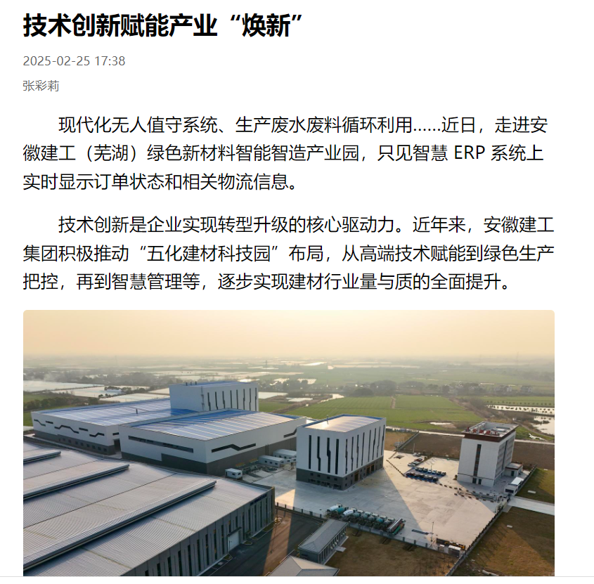 現代化無人值守系統高效運行,智慧 ERP 系統實時更新生產數據,生產廢水廢料循環利用......走進安徽建工(蕪湖)綠色新材料智能智造產業園,眼前呈現出的是一派高端化、綠色化、智慧化、生態化、集成化的產業新貌。