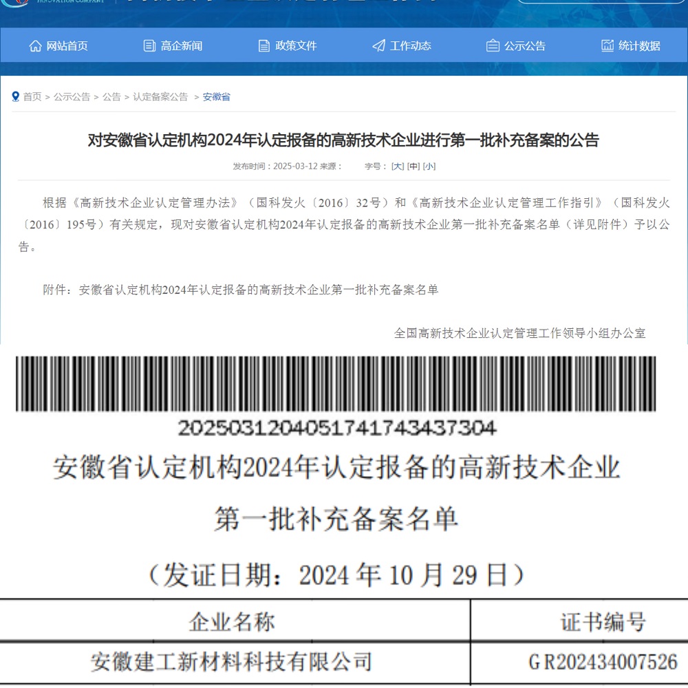 安徽建工新材料科技有限公司通過高新技術企業認定