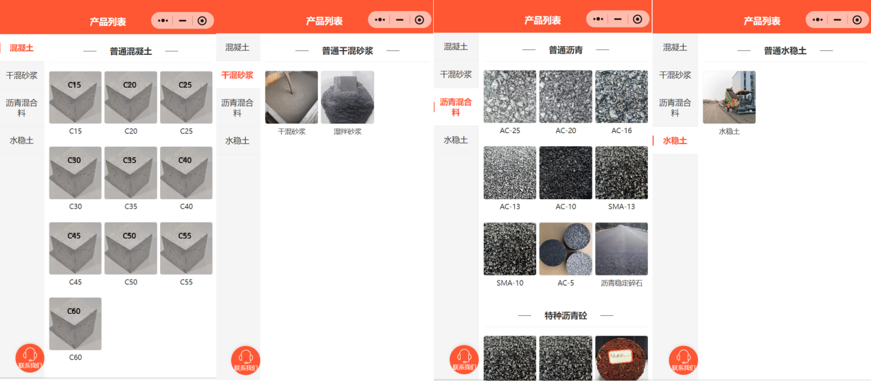 產品列表方面整合了建工建材11家站點生產資源,包括混凝土、干混砂漿、瀝青混合料、水穩土共計38種產品,全方位展示了我司全面的生產能力與實力!