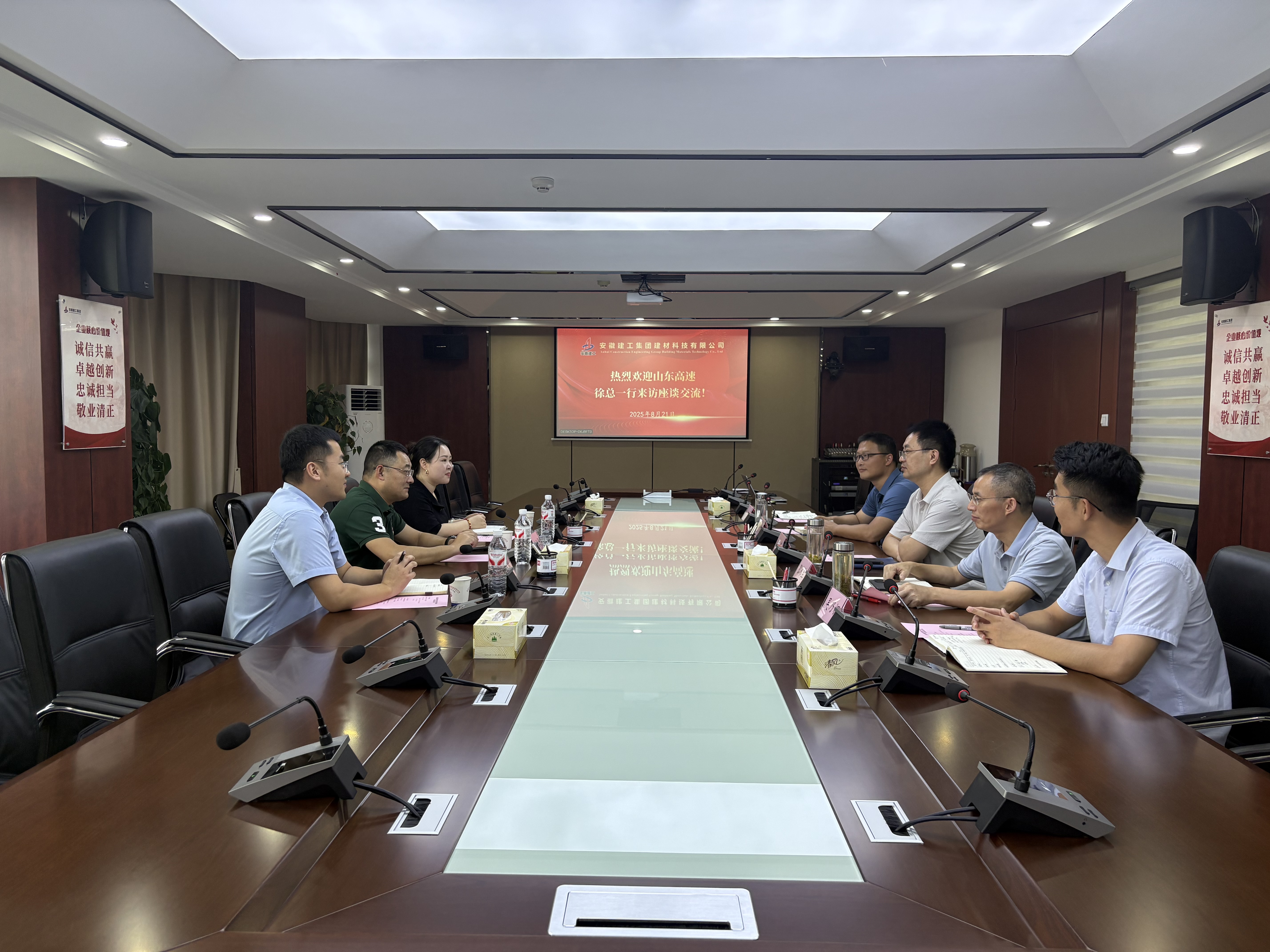 8月21日上午,山東高速瀝青有限公司董事長(zhǎng)徐風(fēng)華一行到訪建工建材。建工建材黨委副書記、董事、副總經(jīng)理李鑫熱情接待并主持召開座談會(huì)。