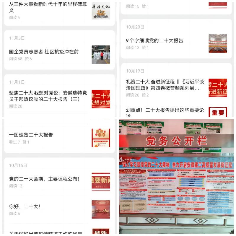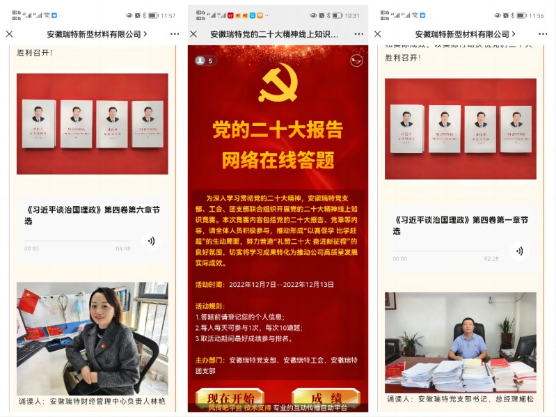 堅持重點跟進學,促入腦入心“黨味”濃。充分利用公司現有宣傳載體,采取多種方式開展學習,提高黨的二十大精神學習的針對性、實效性。運用好宣傳展板、公司公眾號、網站等陣地宣貫二十大精神,促進職工系統學;開展好“禮贊二十大 奮進新征程”微音頻誦讀,黨的二十大知識線上競答等活動,引導職工深入學。在黨的二十大的引領下,廣大黨員職工講政治、謀發展、做表率,不斷拓展與中鐵四局、中建安裝、安徽水安等項目合作,做到重大項目承接有突破、重大債權清理有成效、重點項目服務有方案、重要材料保供有措施。二十大召開以來,安徽瑞特新承接商砼合同額50萬方,鋼材合同額10萬噸、水泥合同額5萬噸,全體職工不斷統一思想、凝聚力量,全力以赴沖刺年度目標任務。