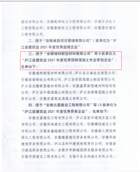 7月5日廬江縣住房和城鄉建設局公布廬住建【2022】58號文件《關于表彰全縣建筑業2021年度優秀企業、單項先進企業及先進個人的通報》。在表彰中授予“安徽瑞特新型材料有限公司”等9家單位為“廬江縣建筑業2021年度優秀預拌混凝土專業承包企業”。